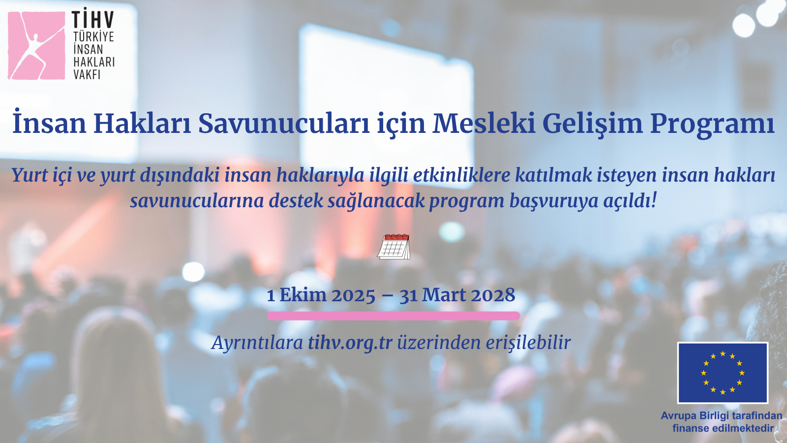 Türkiye İnsan Hakları Vakfı’nın (TİHV), Avrupa Birliği desteğiyle yürüttüğü “Türkiye’deki İnsan Hakları Aktörlerinin Taban Merkezli Bir Yaklaşımla Desteklenmesi ve Korunması Projesi” kapsamında, insan hakları savunucularının kapasitelerini güçlendirerek yürüttükleri çalışmalarda daha etkin olmalarını desteklemek amacıyla tasarladığı İnsan Hakları Savunucuları için Mesleki Gelişim Programı, 1 Ekim 2025 itibarıyla başvuru kabul etmeye başlamıştır.