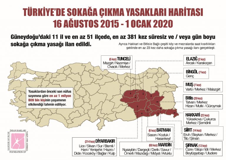 Türkiye İnsan Hakları Vakfı Dokümantasyon Merkezi verilerine göre; sokağa çıkma yasaklarının süresiz (sona erdirileceği tarihin ucu açık bırakılarak) ve/veya gün boyu (24 saat sürmesi öngörülür biçimde) uygulanmaya başlandığı ilk tarih olan 16 Ağustos 2015’ten 1 Ocak 2020 tarihine kadar geçen süre içerisinde toplam 11 il ve en az 51 ilçede resmi olarak tespit edilebilen en az 381 sokağa çıkma yasağı ilanı gerçekleşmiştir.
